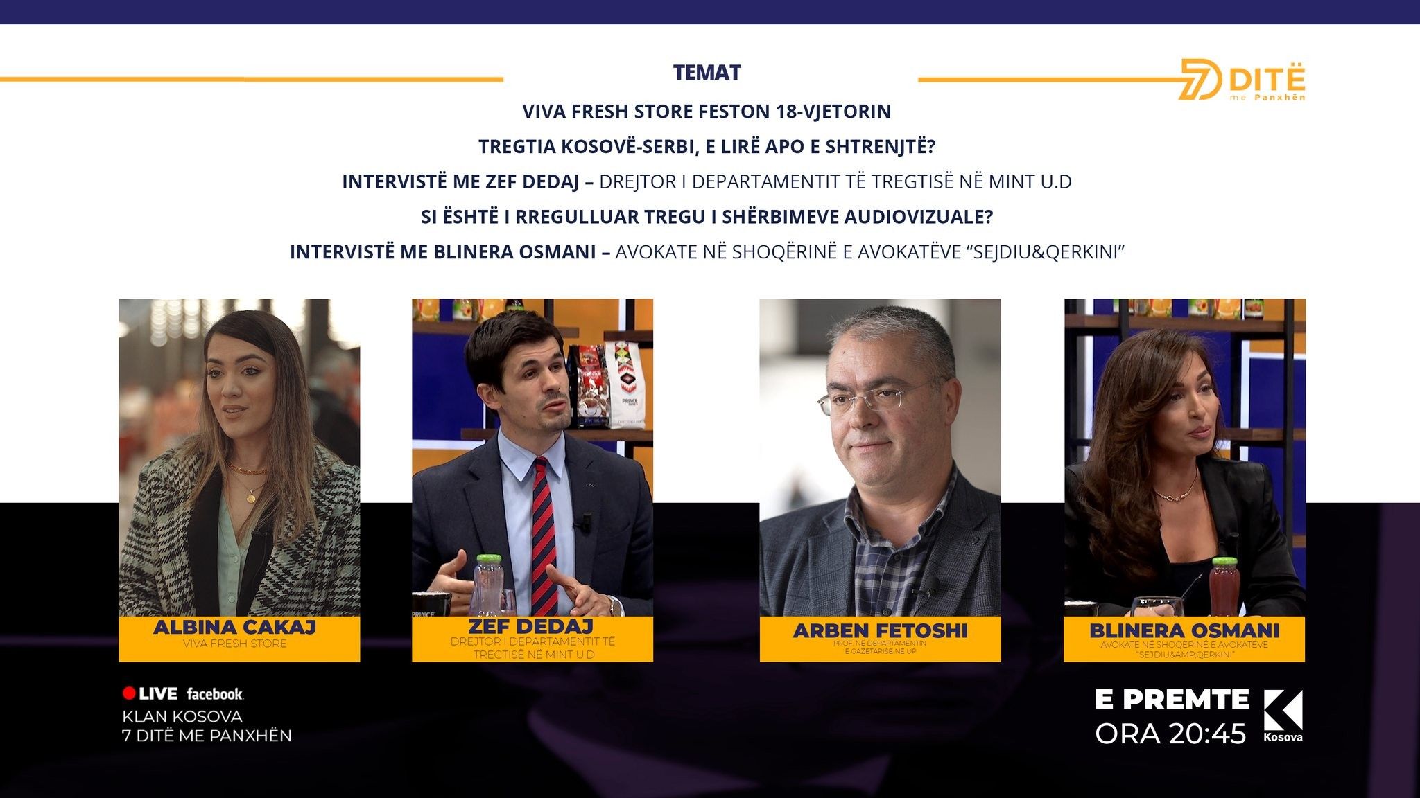 Mbrëmja vazhdon me një diskutim të gjerë mbi Tregtinë Kosovë-Serbi, për atë se a është e lirë apo e shtrenjtë, ku njëkohësisht do të prezantohen statistika ndër-vjetore të këtij raporti tregtar. Ndërsa, në studion e “7 Ditë me Panxhën”, për këtë temë do të diskutohet me Zef Dedaj, u.d Drejtor i Departamentit të Tregtisë në Ministrisë së Industrisë, Ndërmarrësisë dhe Tregtisë.