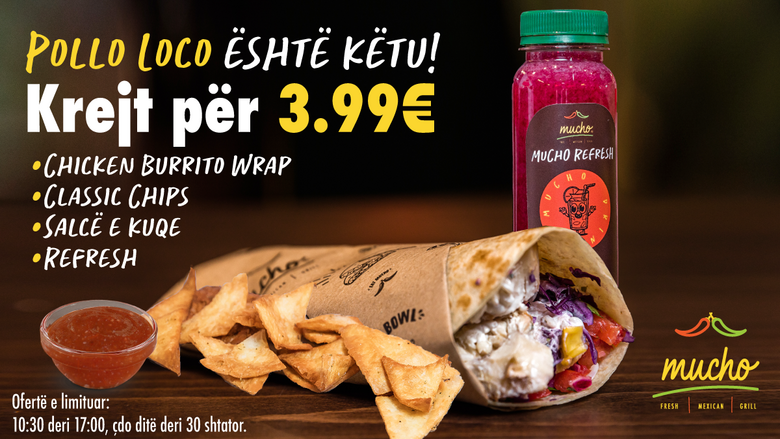 Koncepti më i ri në kryeqytet Eat Mucho ka lansuar ofertën “Pollo Loco” apo “Pula e Çmendur”, e cila përfshinë produkt të limituar “Chicken Burrito Wrap”, si dhe një Tortilla CHIPS, një nga SALCAT unike meksikane, dhe pijen Mucho REFRESH. Të gjitha përgatiten të freskëta çdo mëngjes dhe janë produkte të shtëpisë Mucho.
