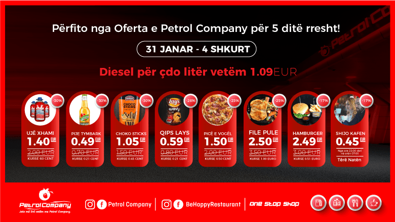 Duke filluar nga data 31 janar e deri më 4 shkurt, në të gjitha pikat e Petrol Company do të ketë zbritje për Diesel, ujë të xhamave, çipsa, pije, dhe ushqime të ndryshme në brendin e restauranteve të saj "Be Happy".