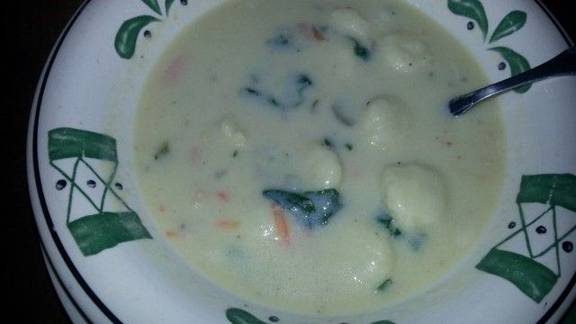 2. Në pak gjalpë kaurdisen qepa dhe hudhra, pastaj shtohen patatet, vera e bardhë dhe supa. Të tëra zihen derisa të zbuten patatet.