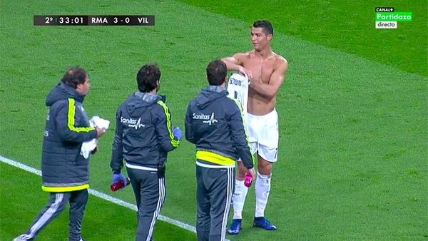 Gjatë pjesës së dytë Cristiano Ronaldos i është grisur fanella gjatë një dyluftimi me lojtarë të Villarrealit dhe kështu u detyrua të dal jashtë për pak sekonda për ta ndërruar atë.