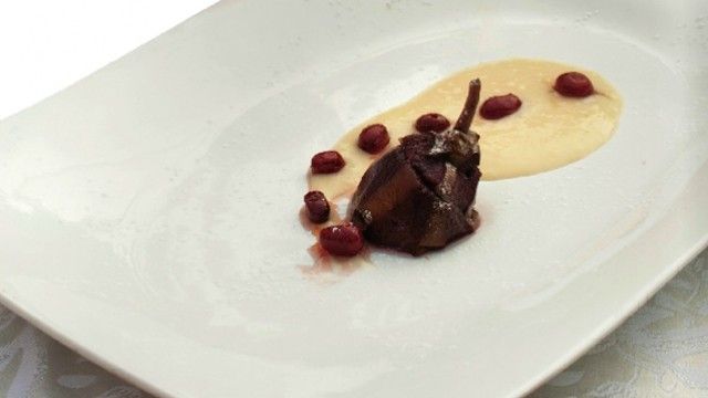 Në fund të lotit vendosim dardhën e zierë të cilën mund ta mbushim me një reçel (në rastin tonë është mbushur me reçel rrushi amerikan).