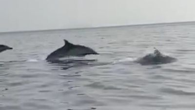 Delfinët mahnitin turistët, spektakël pranë ishullit të Sazanit