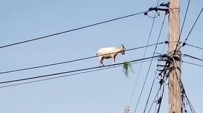 Një dhi është filmuar duke sfiduar gravitetin për të marrë një ‘meze të lehtë’ - ndërsa balancohet në krye të shtyllave elektrike.