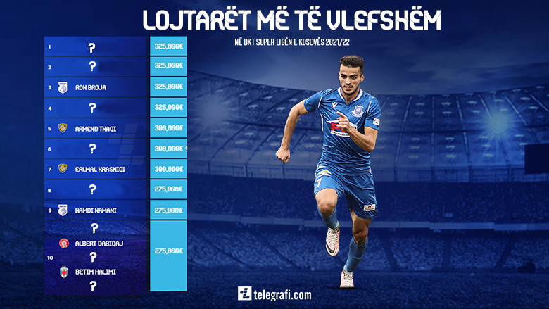 Ajo çfarë bie në sy është se asnjë lojtarë nuk i afrohet vlerës së 500 mijë eurove. Sa i përket lojtarëve katër të parët kanë vlerë të njëjtë, shkruan Telegrafi.