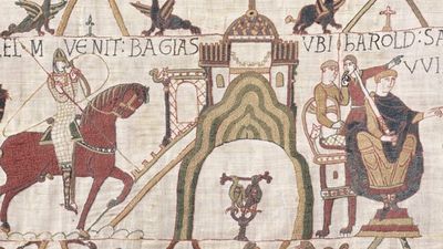 Kjo është ajo që tregohet se bën fisniku anglosakson Harold Goduinsoni. Në skenën e parë, ai është shok me mbretin anglez Eduard, që është pa fëmijë dhe të cilin ai shpreson ta pasojë. Pastaj kalëron, me mustaqet që valëviten, drejt zotërimit të tij ku lutet dhe feston në një banket përpara se të niset për një udhëtim në Francë. Anijet e tij shmangen nga rruga për shkak të motit, ai merret peng, por shpëtohet nga Uilliam i Normandisë. Ata bëhen vëllezër në betejë, duke sulmuar kështjella bashkë. Por, nuk janë të barabartë. Në një skenë të ngarkuar me pasion, Haroldi shtrin krahët për të prekur reliket e shenjta teksa betohet për besnikëri ndaj Uiliamit.
