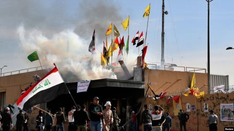 Forcat e sigurisë në ambasadën amerikane në Bagdad përdorën gazin lotsjellës për të shpërndarë protestuesit e udhëhequr nga milicia pro-iraniane pranë kompleksit diplomatik.