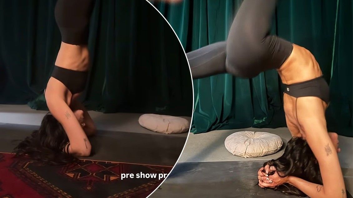 E veshur me veshje sportive, ajo shfaqi ekuilibër, forcë dhe fleksibilitet ndërsa qëndronte kokëposhtë me një kontroll të admirueshëm trupor.