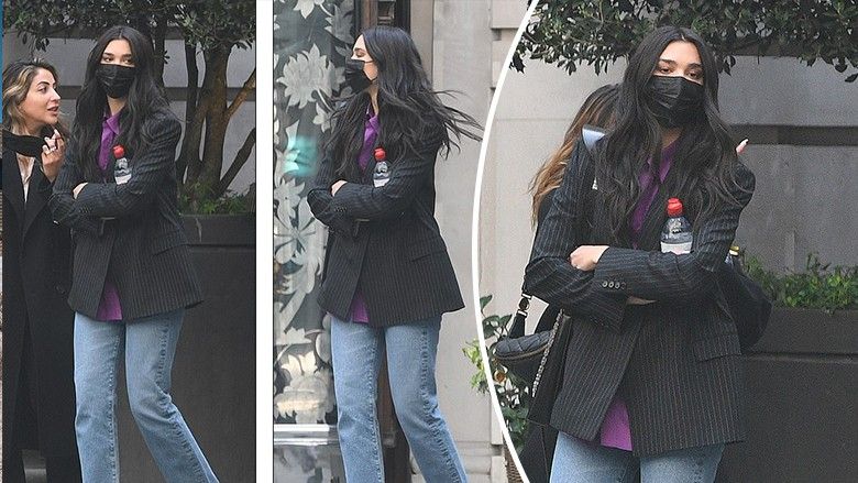 Interpretuesja e hitit “Levitating”, 25 vjeçe, dukej elegante teksa mbërriti në Rosewood London me një xhaketë të errët me vija, të cilën ajo e kombinoi me një bluzë vjollce dhe xhinse të prera.