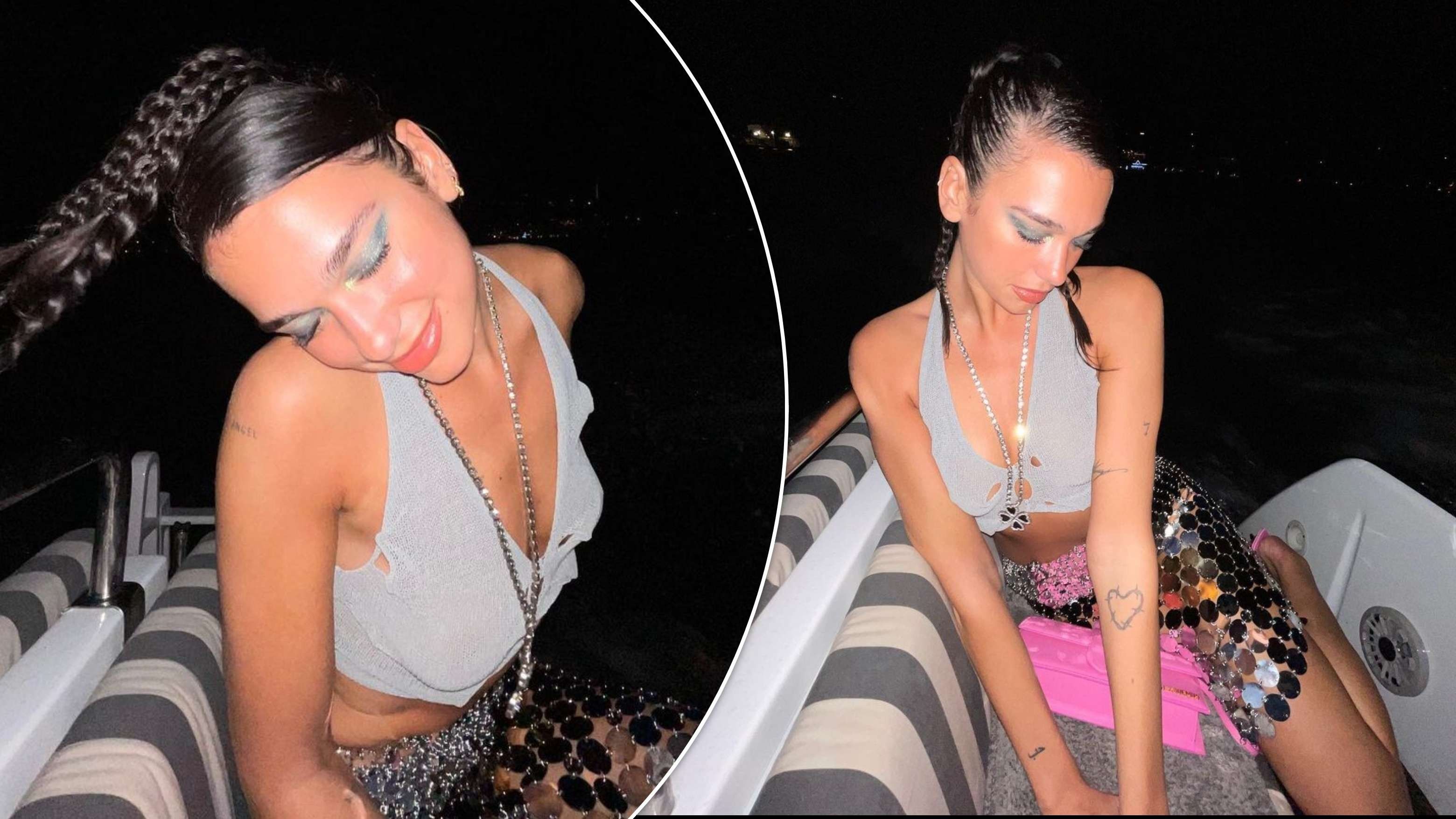 Në fotot (të cilat duket se janë shkrepur në një varkë – super rastësore), Dua ka gjithashtu rimel të kaltër të shndritshëm.