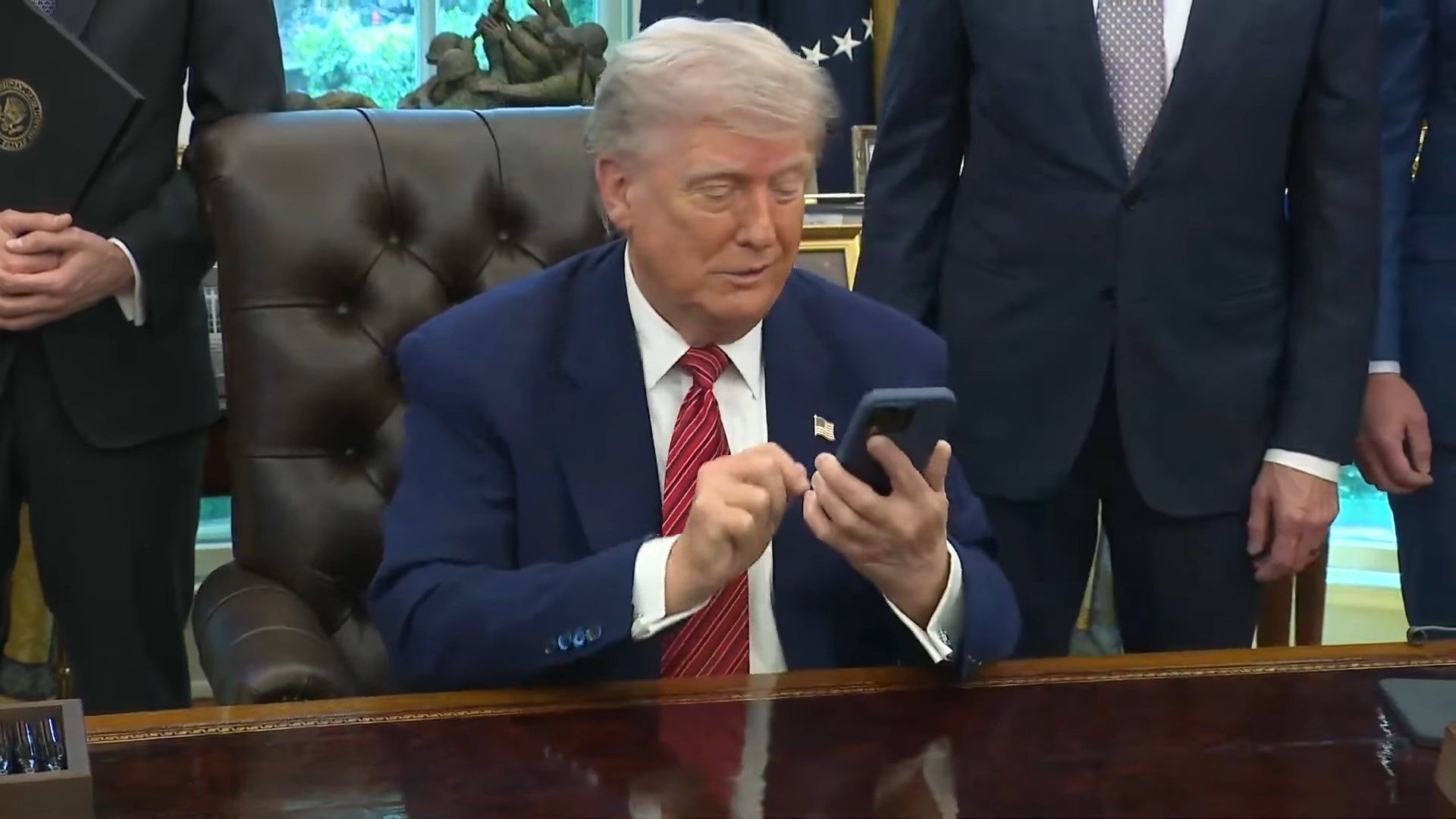 Presidentit amerikan, Donald Trump i ra telefoni dy herë gjatë një konference për shtyp në Zyrën Ovale, e cila ishte e përkushtuar energjisë bërthamore.