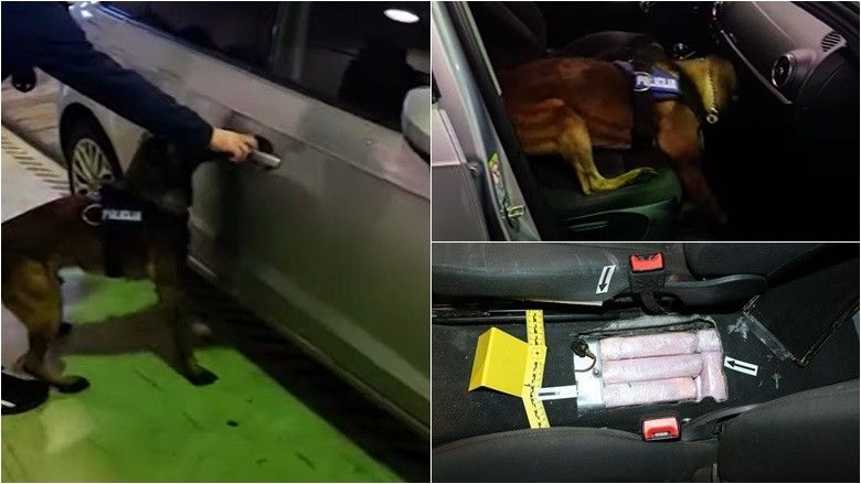 Kur kanë mbërritur në pikën kufitare Karasoviqi të martën rreth orës 11:30, oficerët e policisë kanë ndaluar një 30-vjeçar dhe pasagjerin 44-vjeçar në automjet dhe kanë thirrur detektivin e tyre me katër këmbë Hunt, i cili ka reaguar pozitivisht ndaj pranisë së drogës në pjesën qendrore të mjetit.