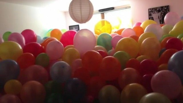 Kur hapë derën për të hyrë në dhomë, ai befasohet nga muri i balonave që i del përpara.