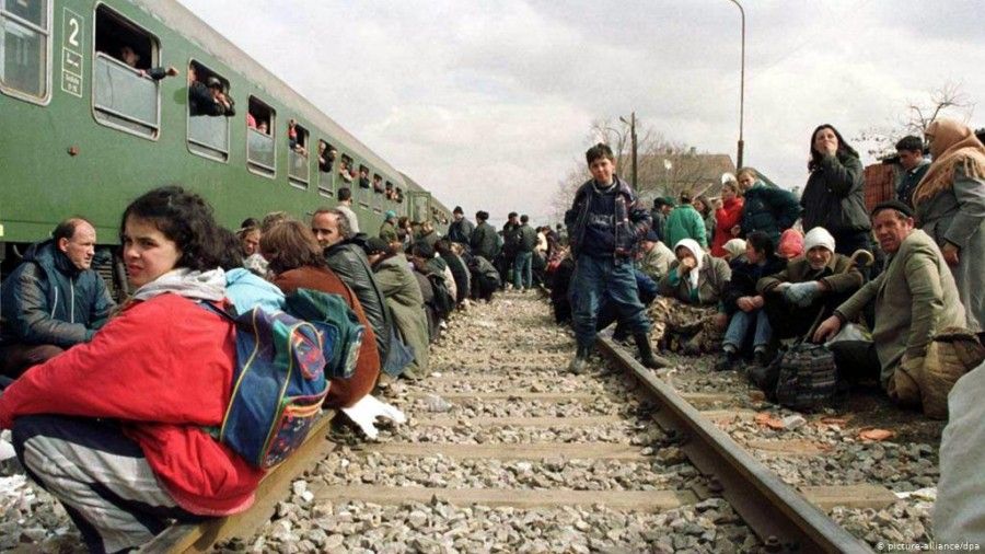 “Në tren, në tren”, duke aluduar në shkuarjen në Maqedoni, ku nën kërcënimin e armëve ishin përzënë shumica e prishtinasve, ishte klithje e shpeshtë e atyre djemve në uniforma maskimi, po edhe pa to, ditëve të para të bombardimeve, apo ajo e njohur mirë për mua “e keni kërkuar NATO-n” të cilën mund ta dëgjoje edhe nga policët, të cilët kërkonin rend në rreshtat e gjatë para furrave të bukës e minimarketet, të cilët i përbënin kryesisht gratë e mbetura shqiptare dhe fëmijët, sepse për burrat nuk ishte e preferuar të dilej në rrugë.