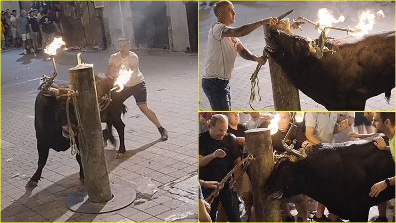 E lidhën për një shtyllë dhe i vendosën pishtarë me flakë në kokë - demi i tmerruar “rënkonte nga frika dhe zemërimi” gjatë një festivali në Spanjë