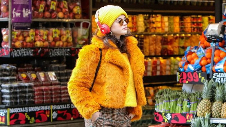 Veshur me një triko të verdhë dhe një kapelë të verdhë, kufje, një pallto ngjyrë portokalli dhe pantallona me katrorë, Selena dukej perfekt moderne.