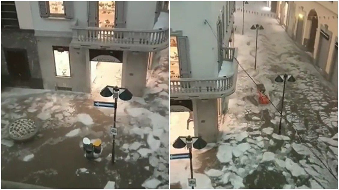 Nga ajo çfarë mund të shihet në këto pamje, janë copëza të bardha akulli në formë rrethore që vërshonin rrugëve të qytetit italian.