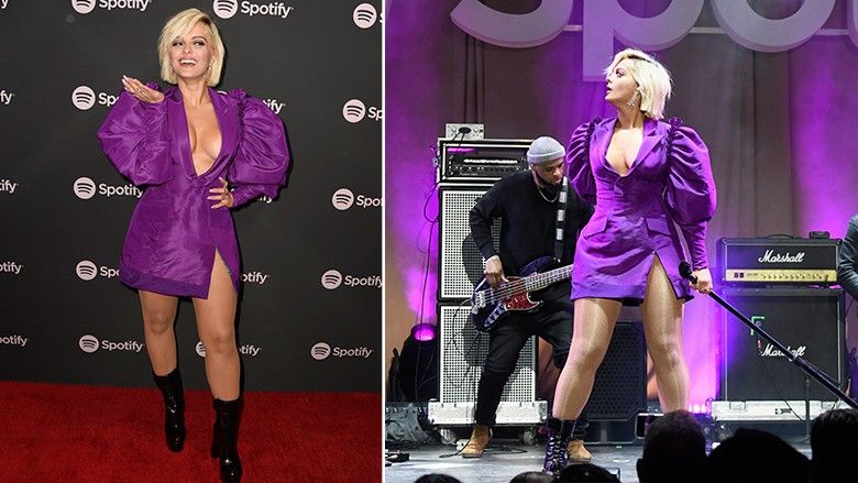 Bebe Rexha dukej vezulluese veshur me një fustan të shkurtër ngjyrë vjollcë, teksa mbante veshur një palë çizme të zeza.