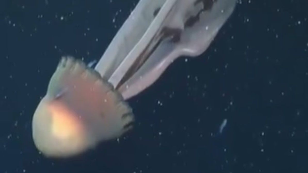 Në video, kandili ndriçohet nga dritat e ROV-së dhe duket sikur po noton poshtë, duke pulsuar ngadalë ndërsa peshqit e vegjël notojnë rreth saj.