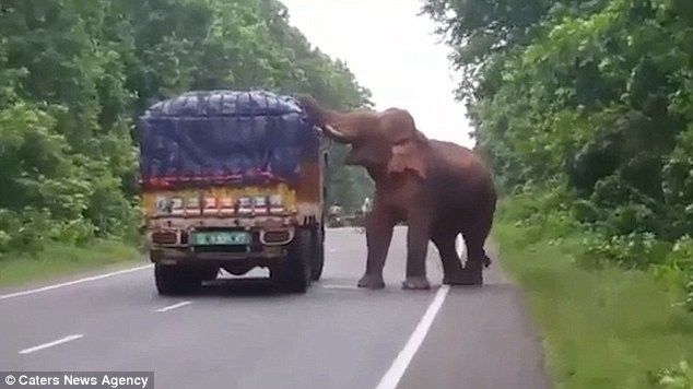 Kamioni që po udhëtonte në Garhbeta të Indisë, është ndaluar nga një elefant që duket se ishte shumë i uritur.