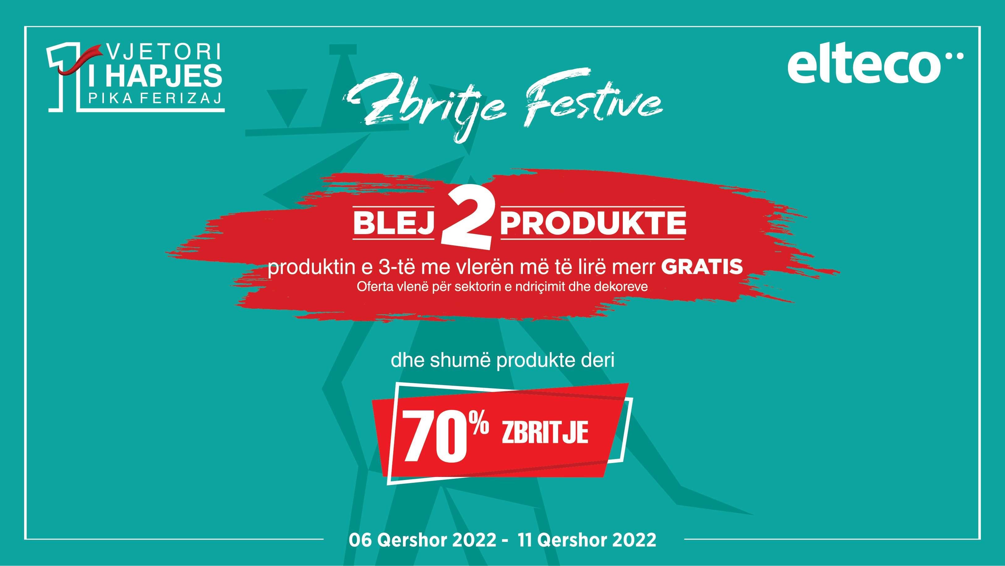 Elteco më 06 deri më 11 qershor po feston 1 vjetorin e hapjes të pikës në Ferizaj, për nder të ditëlindjes së parë po ndriçon me oferta dhe zbritje, më saktësisht vjen me ofertën “Blej dy produkte dhe merr të tretin gratis” si dhe zbritje në produkte deri në 70%.