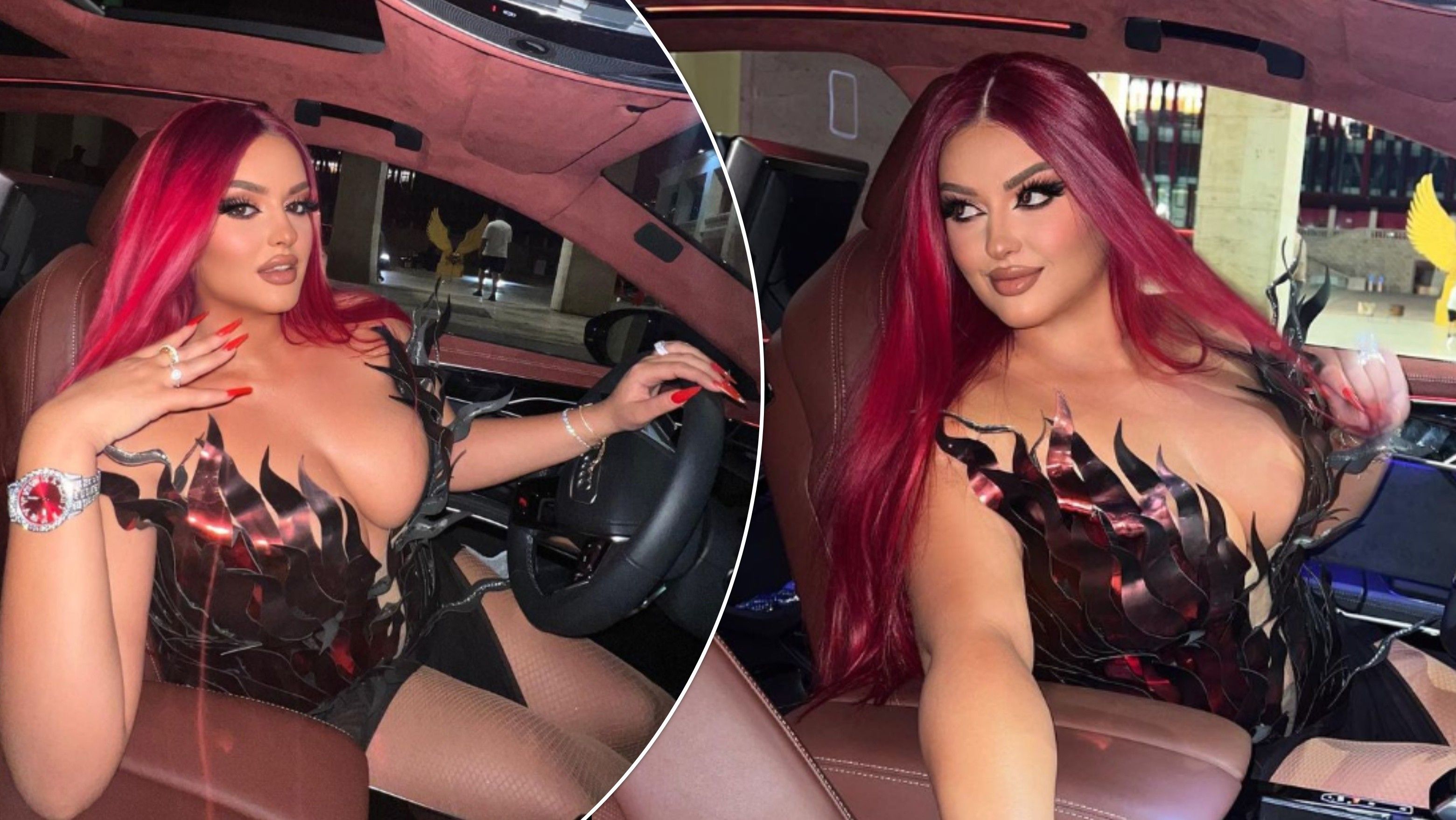E veshur me një korset me dekolte të hapur teksa pozonte në makinë, Enca duke në super formë.
