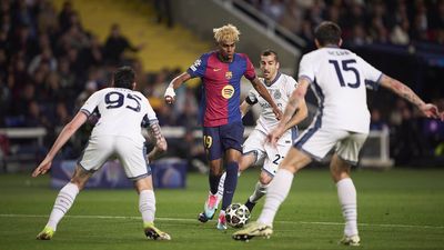 421:"BARCELONA, SPAIN - APRIL 30: Lamine Yamal of FC Barcelona competes for the ball with Alessandro Bastoni of FC Internazionale and Francesco Acerbi of FC Internazionale during the UEFA Champions League 2024/25 Semi Final First Leg match between FC Barcelona and FC Internazionale Milano at Estadi Olimpic Lluis Companys on April 30, 2025 in Barcelona, Spain. (Photo by Manuel Queimadelos/Quality Sport Images/Getty Images)