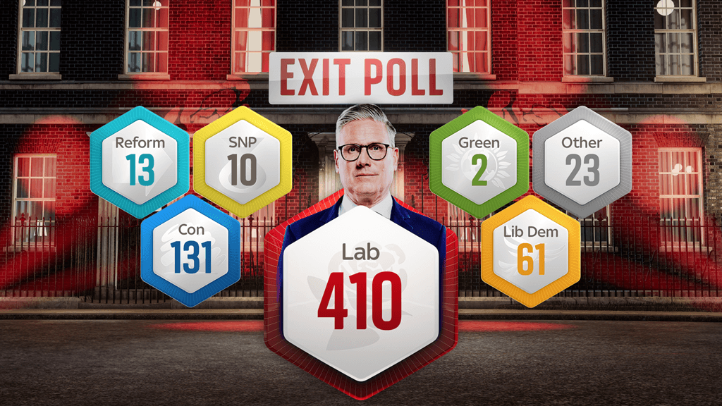 Laburistët parashikohet të fitojnë 410 vende, duke i dhënë Sir Keir Starmer një shumicë prej 170 vendesh, sipas sondazhit nga Ipsos UK për Sky News, BBC dhe ITV News.