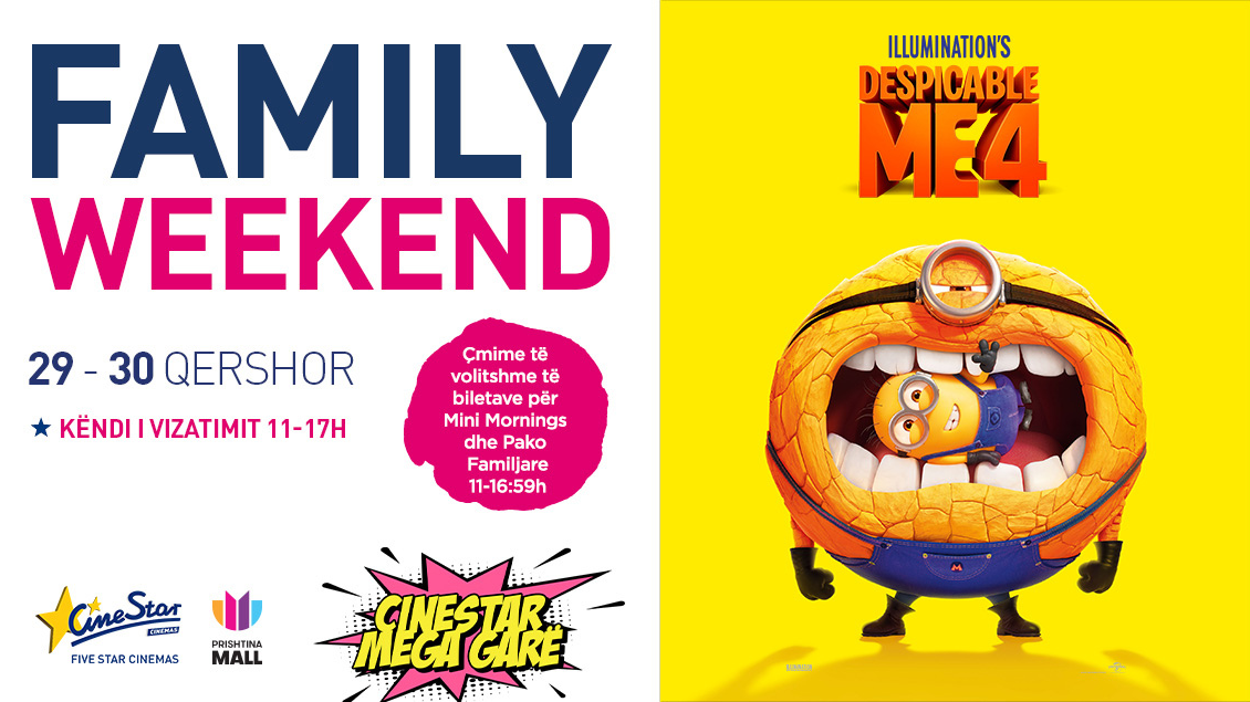 CineStar ju sjellë filmin më të ri të "Despicable Me 4", në ambientin e kinemasë më të bukur!Pas parapremierës me "Despicable Me 4" Weekend, minionët e vegjël dhe Gru do të pushtojnë fundjavën e ardhshme dhe të gjithë do të kenë mundësi fantastike për të parë këtë film hit, të argëtohen dhe të shijojnë vizatimet, si dhe çmime më të ulëta të biletave për Pako Familjare dhe Mini Mornings.