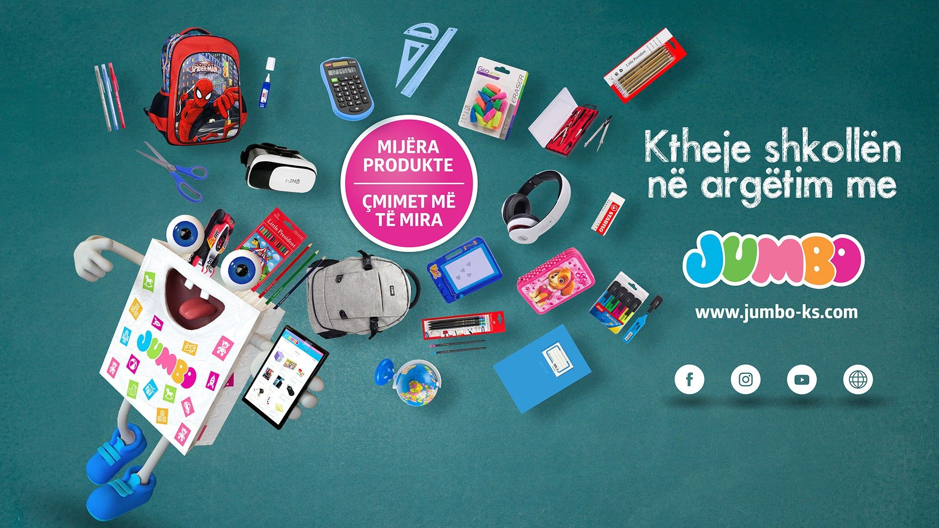 Pra, mjafton një vizitë në dyqanet e JUMBO dhe merrni çantën, portofolët e bojëra gjithfarëlloj fletoret, stilolapsat, mbështjellëset e shumë të tjera. Mjetet e punës për shkenca të sakta, si vizore, kompas, etj, por edhe për artet si gërshërët, ngjitëset, letrat për punë dore dhe gjithçka tjetër që u duhet fëmijëve për të shprehur pa kufi fantazinë e tyre krijuese.