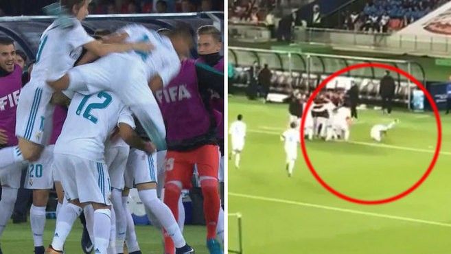 Casemiro vrapoi për të festuar me bashkëlojtarët e tij, por kërcimi i tij mbi Marcelon ishte i lartë duke e kaluar të gjithin dhe duke u rrëzuar.
