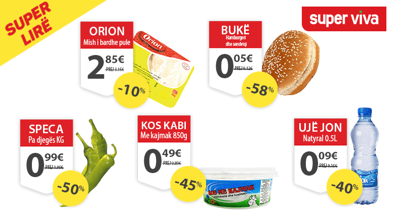 Speca pa djegës - 0.99 euro, Uji - 0.09 euro, Kos me kajmak 800gr - 0.49 euro, Bukë hamburgeri dhe sendviqi - 0.05 euro, Mish i bardhë 900gr - 2.85 euro, janë vetëm disa nga shumë produktet në ofertë për këtë festë Maji, nga supermarketi i cilësuar si më i liri në qytet, Super Viva.