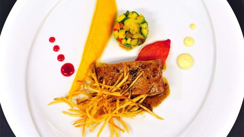 Recetë nga Renato Mekolli, MasterChef (Shije)Përbërësit:▪ 400 gr filetë viçi ▪ 1 copë spec i kuq (të prerë në kubikë) ▪ 1 copë spec jeshil (të prerë në kubikë) ▪ 1 copë spec i verdhë (të prerë në kubikë) ▪ 2 copë kungull (të vegjël) ▪ 1 copë patëllxhan ▪ 2 thelpinj hudhër ▪ 1 copë qepë (e freskët) ▪ 1/2 kokërr qepë (e thatë) ▪ 2 kokërr domate ▪ 10 gjethe borzilok ▪ 5 gr kripë ▪ 1 gr piper ▪ 50 gr gjalpë ▪ 50 ml vaj ulliri ▪ 10 gr kërpudha ▪ 1 gr piper (të shtypur trashë) ▪ 75 ml verë e kuqe ▪ 500 gr karotë ▪ 1 kokërr lëng limoni ▪ 30 ml kos ▪ 60 ml panaPërgatitja: