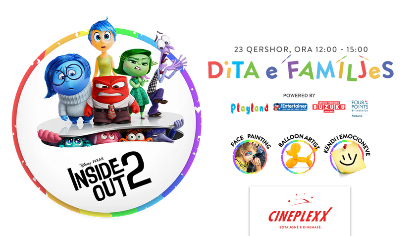 Filmi shumë i dashur për fëmijë “ Inside Out 2 ” ka arritur në Cineplexx, ndërsa këtë të diele më 23 Qershor sjellin eventin "Dita e Familjes", ku do të ketë shumë shpërblime dhe aktivitete të ndryshme për më të vegjëlit tonë!Kinemaja më e madhe në vend Cineplexx, për filmin “Inside Out 2”, do të organizojë eventin "Dita e Familjes".Ky event do te mbahet në të dy kinematë, në Prishtinë duke filluar nga ora 12:00 dhe në Prizren duke filluar nga ora 15:30.
