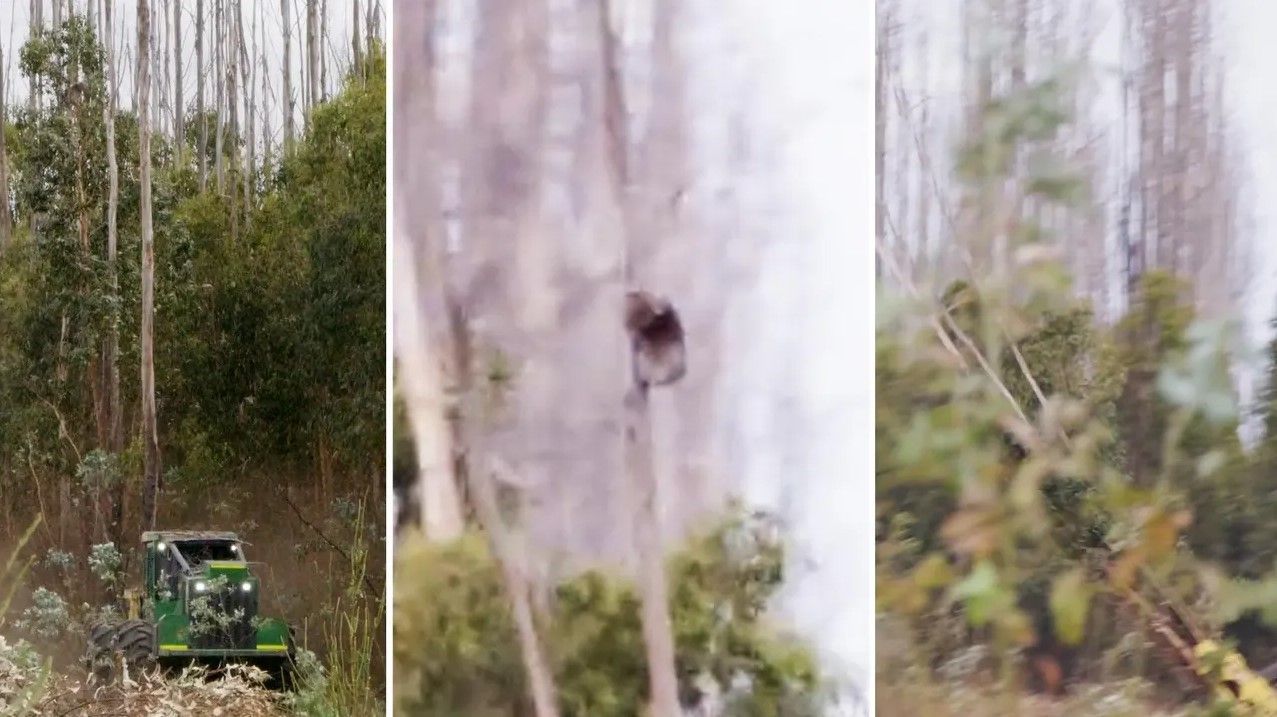 Është e tmerrshme sesi një koalë që tentonte t’i ikte motosharrës, përfundon e përplasur në tokë së bashku me pemën që pritet nga një burrë.