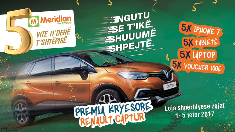 Për t’i shpërblyer shumë nga blerësit e saj besnikë, Meridian Express ka organizuar lojën e madhe shpërblyese me preminë kryesore, veturën e vitit në kategorinë e veturave compact crossover, Renault Captur, modelin e 2017.