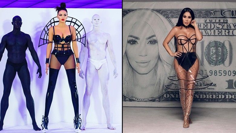 Bleona ishte e veshur në mbathje të zeza lëkure, të ndërthurura me rrjetë në pjesën e sipërme, në tentim për të marrë pamjen dhe simbolin e “Njeriut Vitruvian”, vepër e famshme nga Leonardo Da Vinçi.