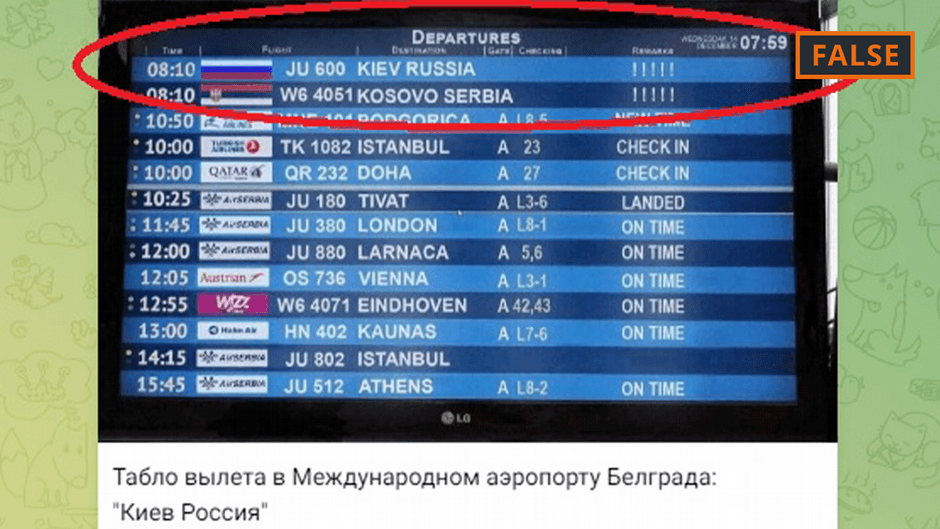 Edhe tabela e fotografuar nuk është në aeroportin e Beogradit. I pyetur nga DW një zëdhënës i Aeroportit "Nikola Tesla" në Beograd sqaroi se tabelat dhe ekranet e fluturimeve në këtë aeroport janë ndryshe nga ajo që shihet në fotografi.