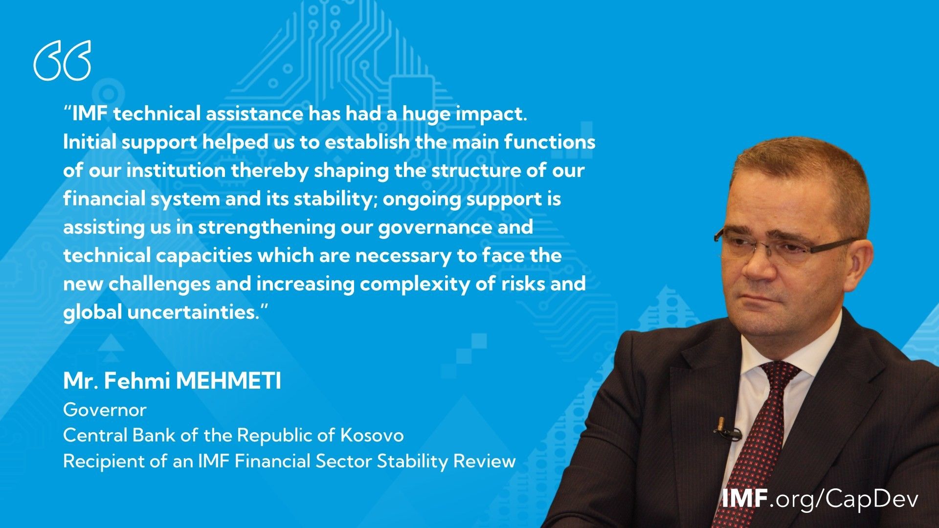 “Asistenca teknike e FMN-së ka pasur një ndikim të madh. Mbështetja fillestare na ndihmoi të vendosim funksionet kryesore të institucionit tonë duke formësuar strukturën e sistemit tonë financiar dhe stabilitetin e tij; mbështetja e vazhdueshme po na ndihmon në forcimin e qeverisjes dhe kapaciteteve tona teknike që janë të nevojshme për përballen me sfidat e reja dhe kompleksitetin në rritje të rreziqeve dhe pasigurive globale”, ka thënë Mehmeti që citohet në postimin e FMN-së.