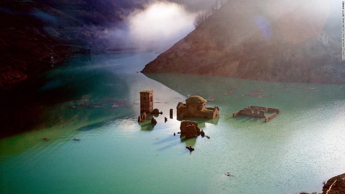 Të zhytur nën 34 milionë metra kub ujë, strukturat ende të paprekura të fshatit të braktisur - përfshirë shtëpitë prej guri, një urë, varreza dhe kisha e San Teodoro - shihen vetëm kur diga zbrazet për mirëmbajtje.