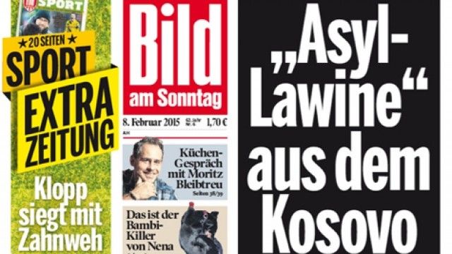 Ballina e gazetës “Bild”, i cili në edicionin e së dielës shitet në 3 milionë ekzemplarë, nxjerr artikullin për emigrantët kosovarë me titull: “Ortek azilkërkuesish nga Kosova”, dhe më pas vijon rrëfimi për atë sesi nga 500 kosovarë në ditë janë duke e lëshuar vendin e tyre me destinacionin kryesor Gjermaninë.