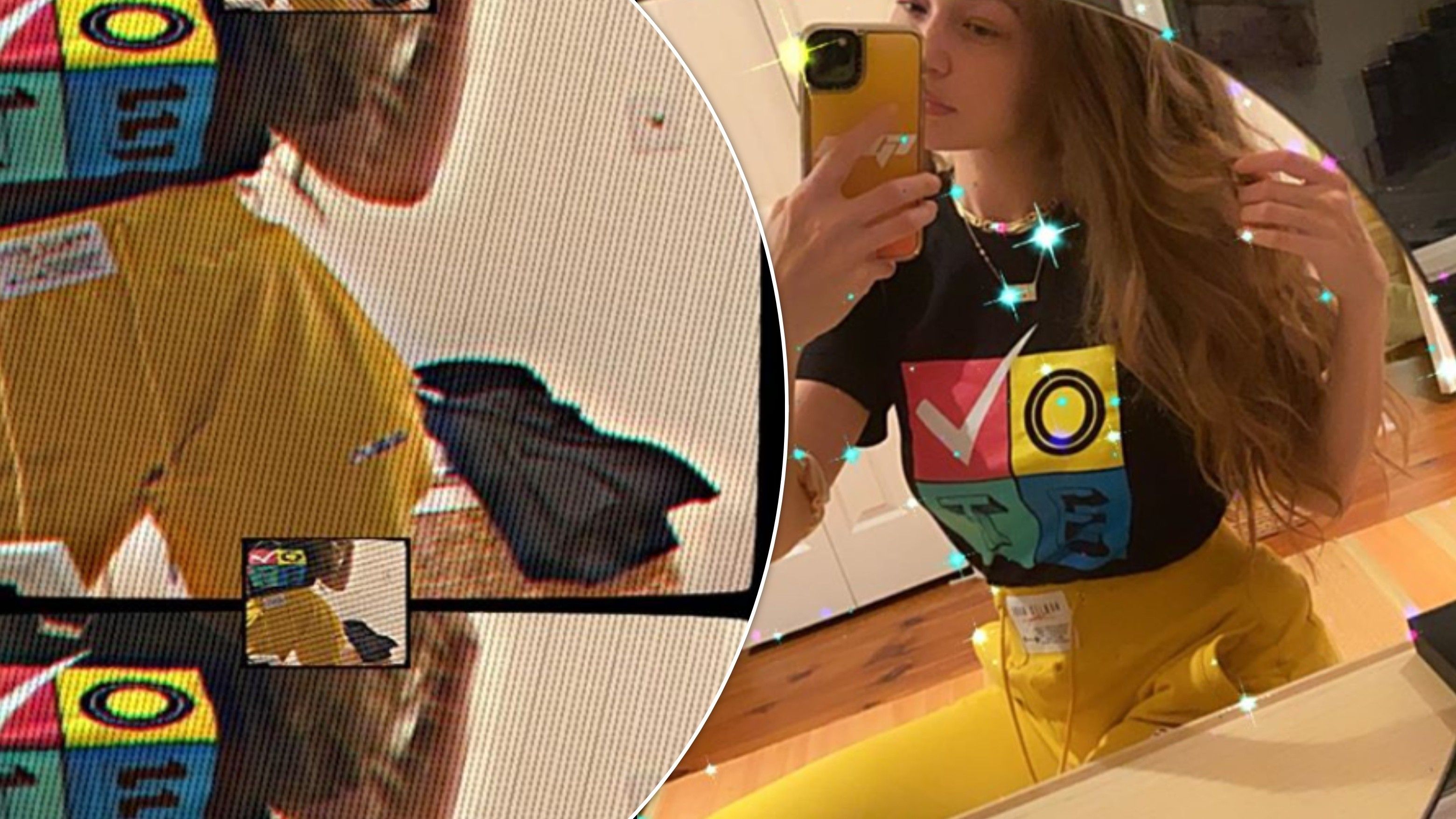 Në postim, Hadid publikoi disa imazhe me një bluzë të zezë në të cilën shkruante ‘voto’ dhe në një palë pantallona të verdhë.