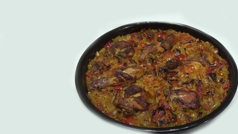 Përbërësit׃- 1 kg kofshë pule,- 3 qepë,- 3 domate të mëdha,- 3 kokë hudhra,- 100 gr oriz,- 15 deri në 20 speca,- 1 karotë e madhe,- vaj,- kripë,- erëza të thata,- piper.Përgatitja׃