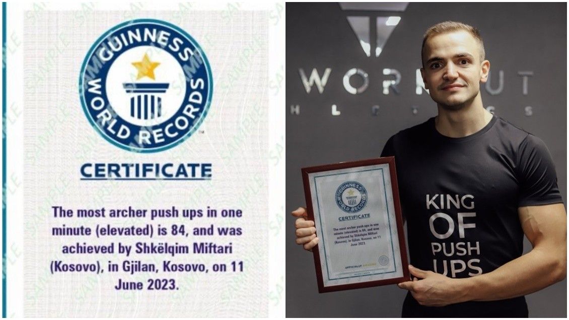 “Miq, shokë dhe gjithë ju dashamirës, ju njoftoj që pas një pune dhe përkushtimi të madh arrita të vendos rekordin e ri botëror në Guinness World Record në kategorinë ‘The most archer push ups in one minute (elevated)’”, shkroi gjilanasi.