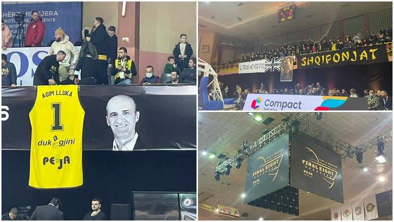 Tifozët e pranishëm në palestër dhe klubi, në shenjë nderimi, kishin mbushur arenën me fotografi për Agim Llukën.