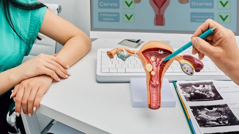 • Ekzaminimi digital (bimanual) i legenit: Njëra dorë ngre mitrën, ndërsa tjetra shtyn fundusin poshtë. Cistet ose dhëmbëzimet pas mitrës jenë të prekshme.