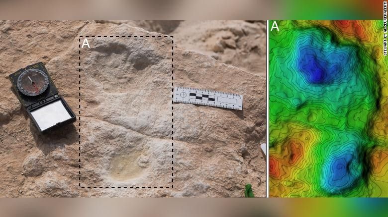 Por, çuditërisht, studiuesit thanë se kanë zbuluar shtatë gjurmë këmbësh njerëzish, të cilat, nëse konfirmohen, mund të jenë provat më të hershme të specieve njerëzore në Gadishullin Arabik.