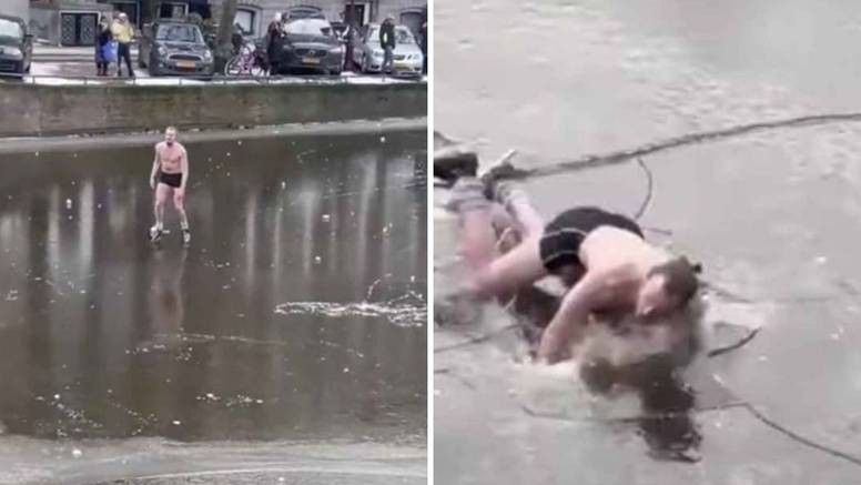 Videoja, e cila u bë një 'hit' në mediat sociale, tregon këtë burrë që patinon në një kanal të ngrirë të Amsterdamit, i veshur vetëm me brekë të vogla. Në një moment akulli çahet dhe burri bie në ujë të ftohtë.