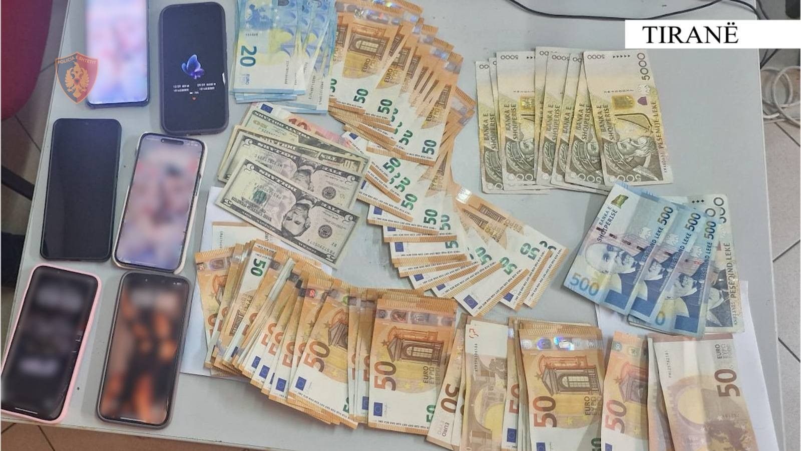 Policia sekuestroi një shumë e konsiderueshme parash, të dyshuara të përfituara nga ushtrimi i kësaj veprimtarie, 3 celular dhe 9 karta krediti.