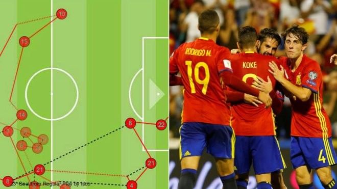 Aksioni i përfunduar me gol kombëtarja ‘La Roya’ e fillua nga portieri David De Gea dhe i përmbyllur me sukses nga Isco, ndërsa vetëm Jordi Alba nuk u përfshi në të.